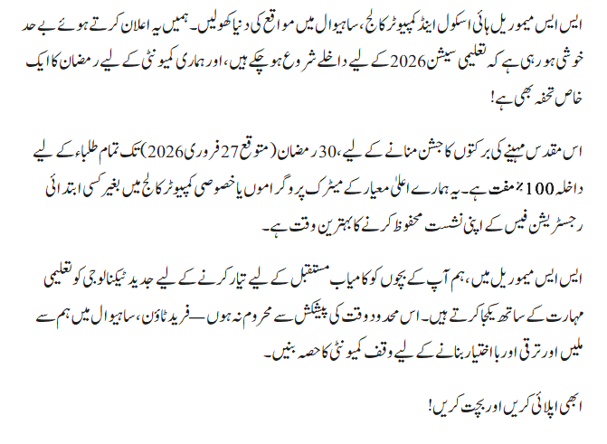 Unlock a world of opportunities at SS Memorial High School & Computer College, Sahiwal. We are excited to announce that admissions are now open for the 2026 academic session with a special Ramadan gift for our community!