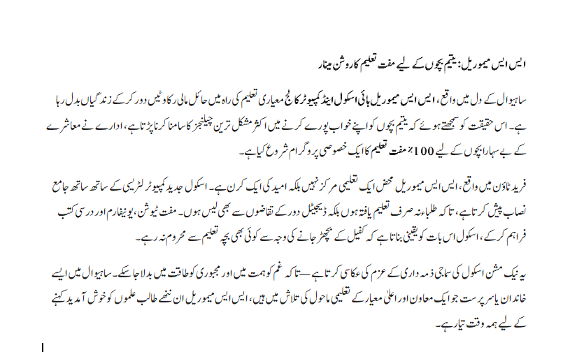 This noble mission reflects the school’s commitment to social responsibility—turning grief into growth and vulnerability into strength. For families and guardians in Sahiwal looking for a supportive and high-standard educational environment, SS Memorial stands ready to welcome these young learners.